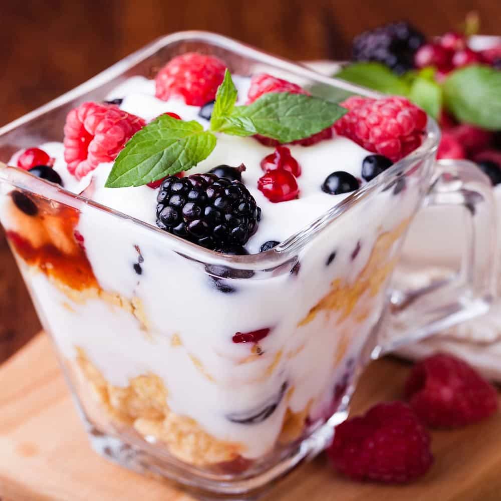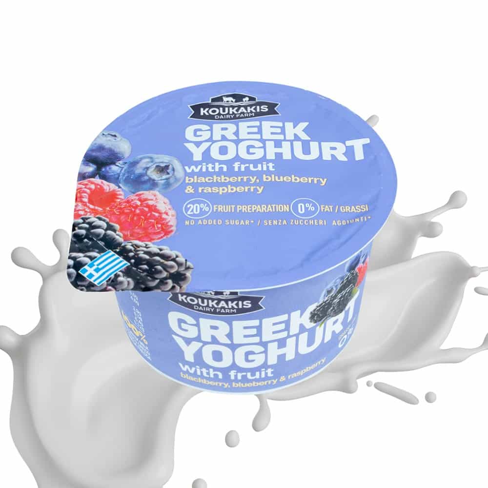 Enjoy the delicious Koukakis Farm Greek yogurt with berries. Strained yogurt 0% fat with yummy berries! Plummy combination of Blackberry, Blueberry and Raspberry with zero-fat Greek yogurt and min 20% fruit content.