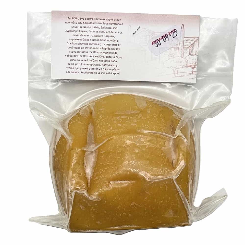 Texture: Parcharotyri is semi-hard with a slightly crumbly yet creamy texture, making it versatile for various culinary applications. Its unique aging process gives it a sturdy body that holds up well both on its own and in cooked dishes.