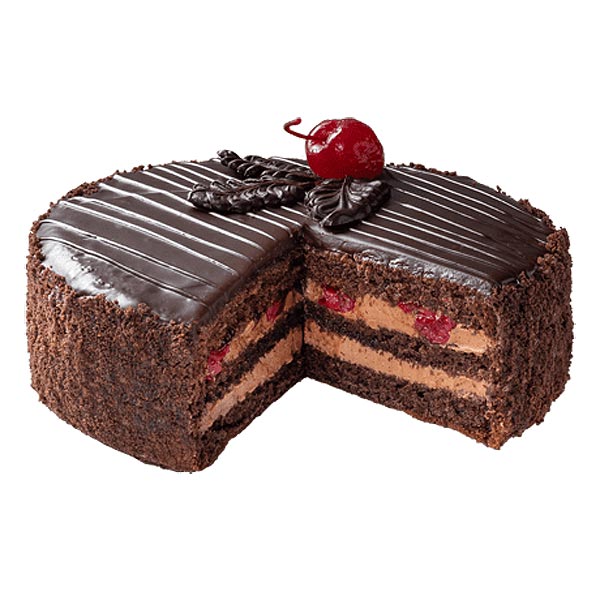 Cake “Prague” with Sour Cherry – the familiar cocoa flavor of the ‘Prague’ cake, complemented by the sweet and tart taste of simmered sour cherries. The sponge cakes are soaked in sour cherry syrup.”